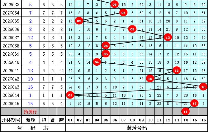 蓝球分析:上期蓝球为大号15,最近10期大小蓝球号码分别出现5次,走势相当,本期蓝球关注大号,推荐号码14。